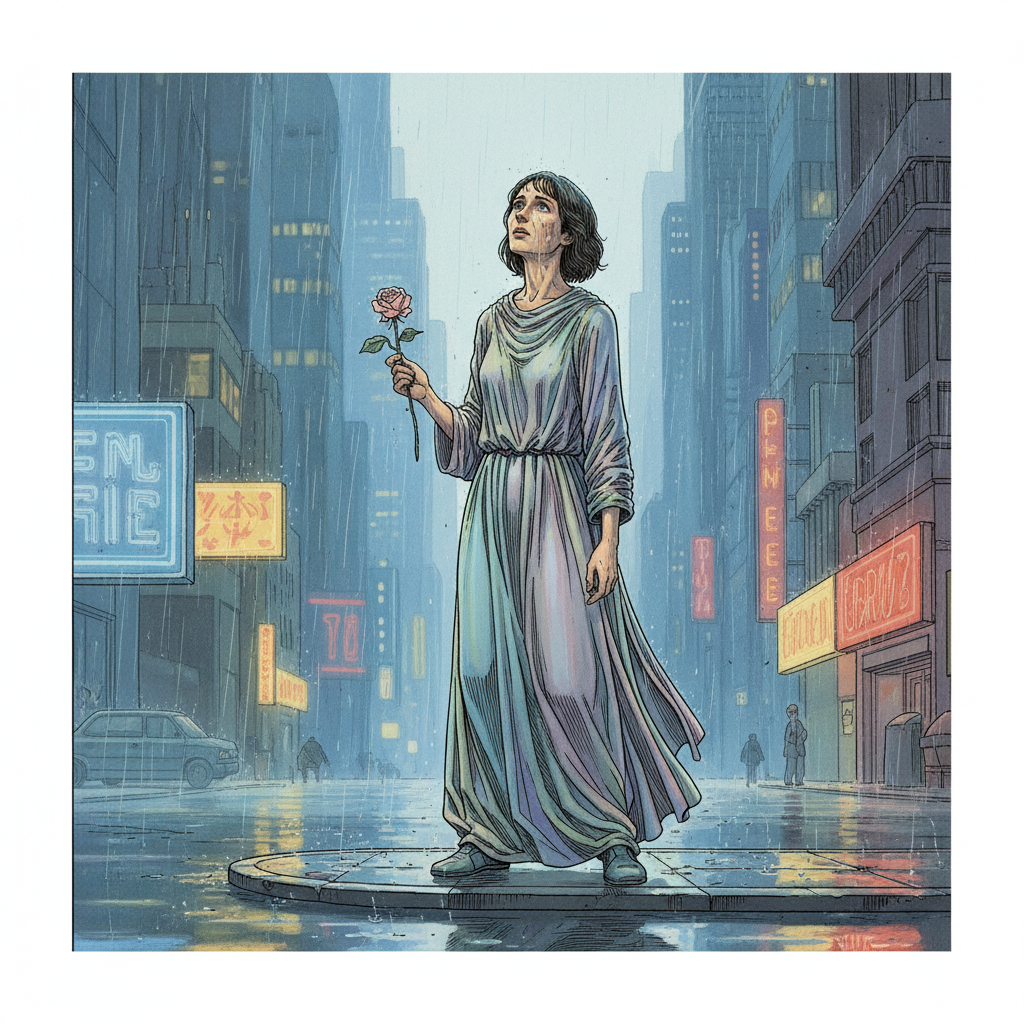 "A solitary figure stands on a rain-slicked street corner, gazing upwards with a mixture of hope and uncertainty. Dressed in flowing, iridescent fabrics that shift between vibrant hues and muted grays, they clutch a single, wilting rose. The background features towering, blurred skyscrapers partially obscured by a heavy downpour, with flickering neon lights casting an ethereal glow on the scene."