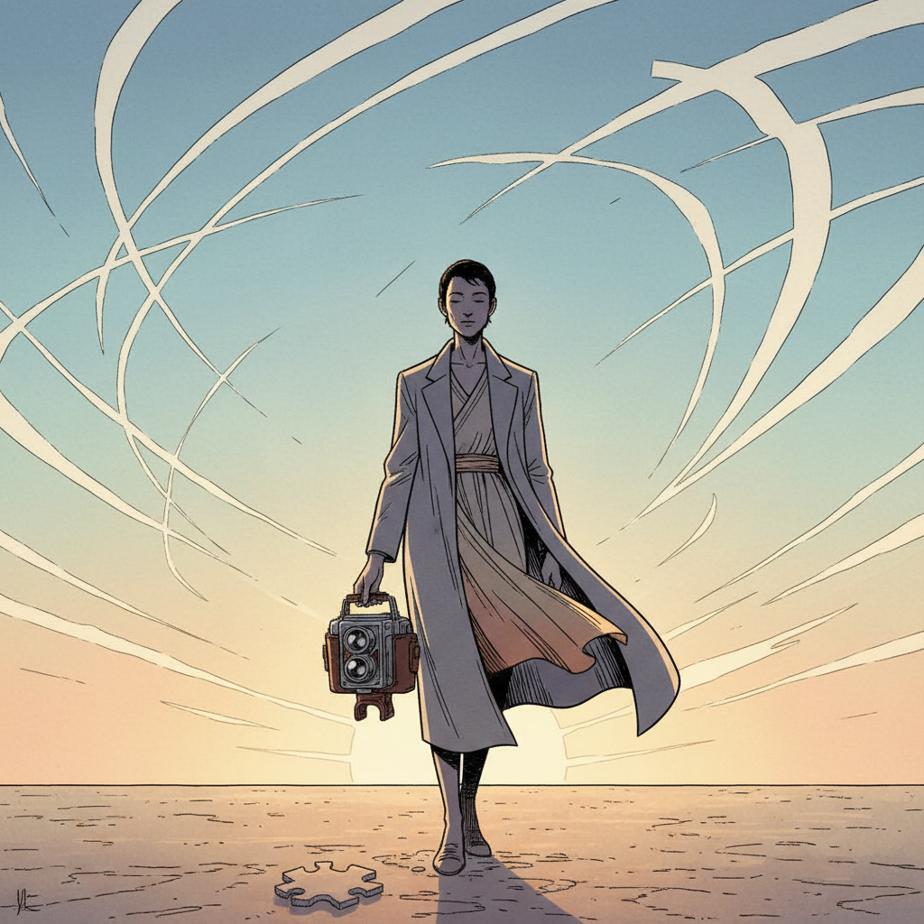 "A figure stands silhouetted against a dawn sky fractured by contrails, dressed in a tailored coat that hangs open, revealing a glimpse of brighter fabric; they face forward, one hand resting on the worn leather of a vintage camera. The environment evokes a sense of forward momentum and quiet reflection, with muted grays gradually giving way to hopeful oranges and yellows on the horizon. A single, discarded puzzle piece lies at the figure's feet, partially illuminated."