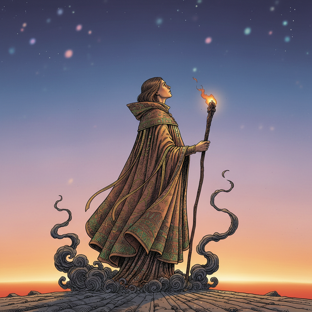 "A lone figure stands silhouetted against a twilight sky, gazing upwards with an expression of quiet contemplation as wisps of dark smoke curl around their feet. The figure is draped in a richly textured, earthy-toned cloak with subtle hints of vibrant green and gold threading, and holds a single, unlit torch. The environment transitions from a fiery orange horizon to a deep indigo above, punctuated by a scattering of distant, blurred stars."