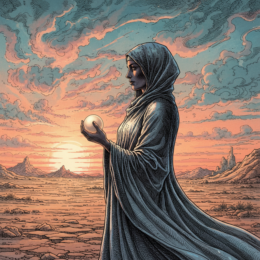 "A figure stands silhouetted against a twilight sky streaked with fading golds and deep blues, head tilted slightly downward as if contemplating a distant horizon. They are draped in layered, flowing fabrics of muted silver and slate gray, cinched with a braided cord of deep crimson, holding a single, iridescent seashell. The surrounding landscape is a blurred mix of soft, sandy dunes meeting a dark, churning sea, lit by the faint, ethereal glow of a faraway constellation."
