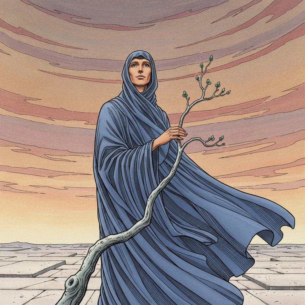 "A lone figure stands silhouetted against a turbulent, ochre-tinged sky that meets a fractured landscape of pale stone. Draped in flowing, indigo fabric, the figure gazes upwards, one hand gently resting on a weathered, silvered branch sprouting nascent emerald buds. The overall palette evokes somber reflection and the fragile beginnings of hope amidst adversity."