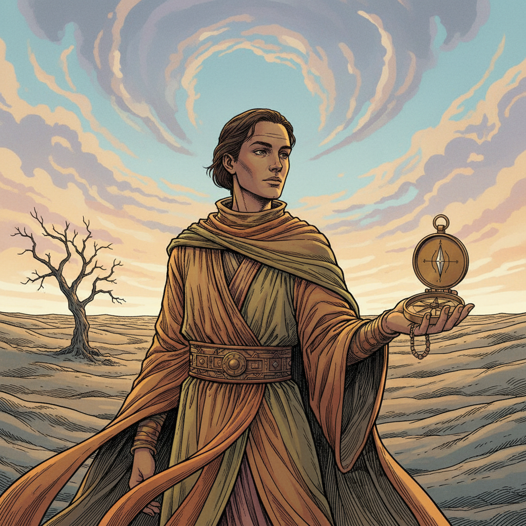 "A figure stands silhouetted against a crepuscular sky, clad in earth-toned garments cinched with a burnished, metallic belt; their gaze is directed towards a distant, hazy horizon. Swirling ochre and slate-grey sands surround them, punctuated by the stark, skeletal branches of a lone, wind-worn tree, and a single, antique compass rests open in their palm. The somber palette evokes resilience and a quiet acknowledgement of time's passage amidst uncertain landscapes."