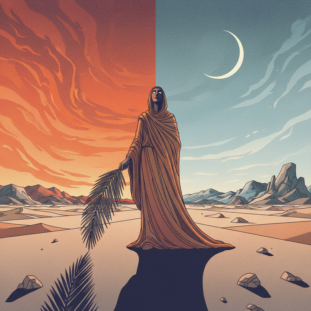 "A figure stands silhouetted against a horizon split between a fiery, turbulent sunset and a cool, serene lunar glow. Draped in flowing, earth-toned fabric, they hold a single, long palm leaf, its shadow stretching far behind, while gazing upwards with a mixture of hope and solemn contemplation. The overall palette blends metallic grays, deep oranges, and muted blues to evoke a sense of conflict and aspiration."