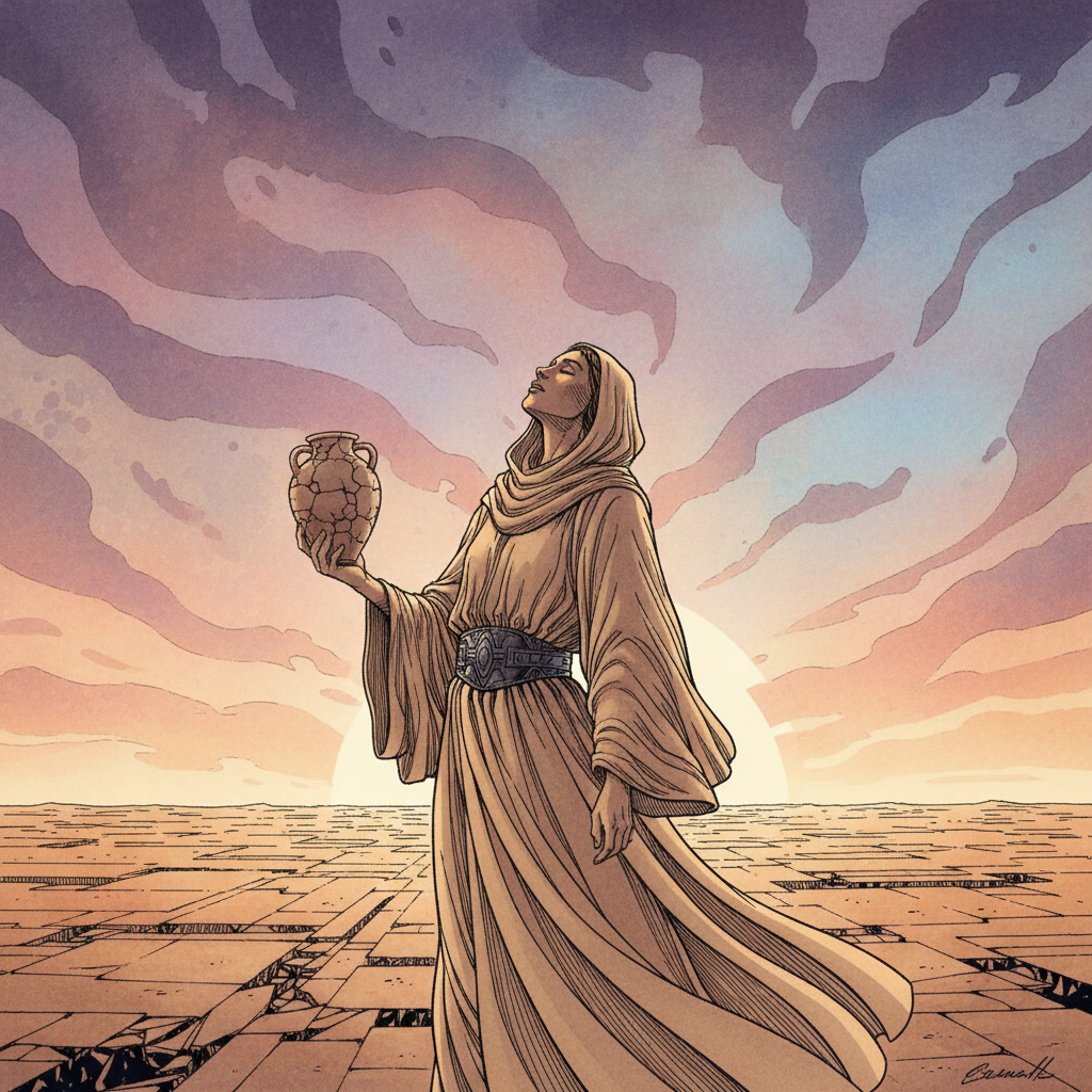 "A lone figure stands silhouetted against a bruised, ochre sky, face tilted upwards as if sensing a shift in the wind. Draped in flowing, sand-colored fabric cinched with a darkened metallic belt, the figure clutches a single, cracked clay vessel. The parched earth stretches into the horizon, mirroring the turbulent sky, hinting at both fragility and enduring strength."
