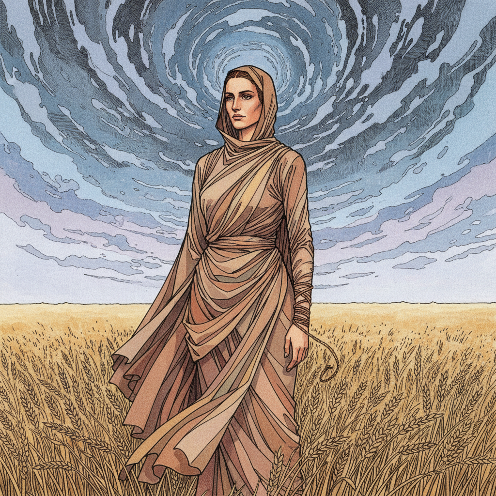 "A solitary figure stands draped in muted earth-toned silks, gazing towards a fractured horizon. The sky swirls with discordant blues and grays, hinting at both fragility and inner strength, while a single, tarnished metallic thread winds around their wrist, symbolizing strained connections. They stand amidst a field of dry, golden wheat under a turbulent sky."